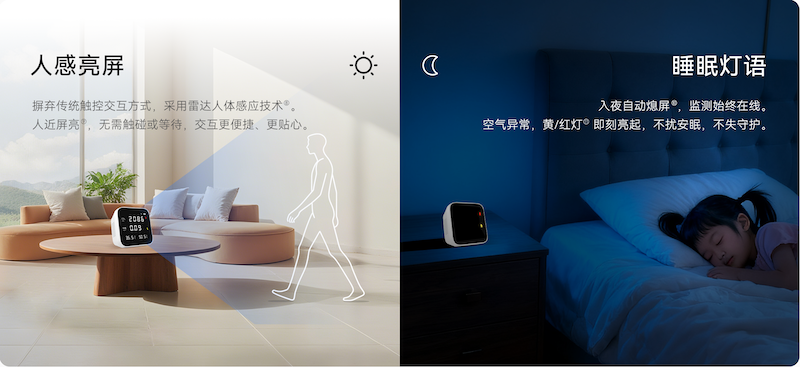 To visually indicate air quality changes, the product features a dual-color light system: yellow for pollution exceeding standards and red for severe exceedances. During daytime, both the screen and lights provide alerts. At night, the device automatically enters sleep mode, dimming the screen while retaining gentle light cues—balancing reliability with thoughtfulness.